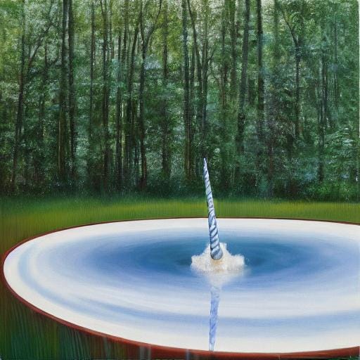 Substack’s image generator did not like any variation of ‘(two-horned) unicorn drinking from a forest pool’ as a prompt. One offering involved disembodied tails, fluttering about like fairies and butterflies, leaving rainbow trails!
